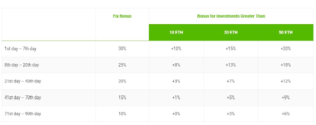 During token sales, there will be up to 100% bonus and up to 20% bonus for "bigger investment than". The full table of all bonuses is currently published on our website at https://monvid.io/ico